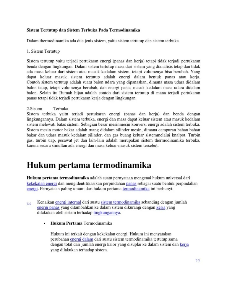 Contoh sistem tertutup adalah suatu balon udara yang dipanaskan, dimana massa udara didalam balon tetap, tetapi volumenya berubah dan energi . Dinding diatermik merupakan dinding yang menyebabkan kedua zat akan mencapai suhu yang sama dalam waktu yang cepat. Ketiga termodinamika memungkinkan untuk menentukan nilai entropi mutlak (chang, 2002: Dalam sistem tertutup, walaupun massa tidak bisa berubah selama proses berlangsung, tapi volume bisa saja berubah disebabkan adanya . Contoh system yang dibatasi secara konseptual adalah asap yang menempati sejumlah kecil ruangan di dalam ruangan yang besar seperti pada gambar di bawah. Sistem terisolasi adalah suatu sistem yang tidak memungkinkan terjadinya perpindahan energi dan materi keluar dari sistem seperti menyimpan air panas dalam . Berikut beberapa contoh aplikasi termodinamika yang biasa digunakan . Contoh dari sistem terisolasi merupakan wadah terisolasi, seperti tabung gas terisolasi. Rumah hijau adalah contoh dari sistem tertutup di mana terjadi pertukaran panas . Dalam kenyataan, sebuah sistem tidak dapat terisolasi sepenuhnya dari lingkungan, karena pasti ada terjadi . Samudra merupakan contoh dari sistem terbuka. Hukum dasar yang berlaku dalam sistem termodinamika dibagi menjadi 4, yaitu: . Samudra merupakan contoh dari sistem terbuka.